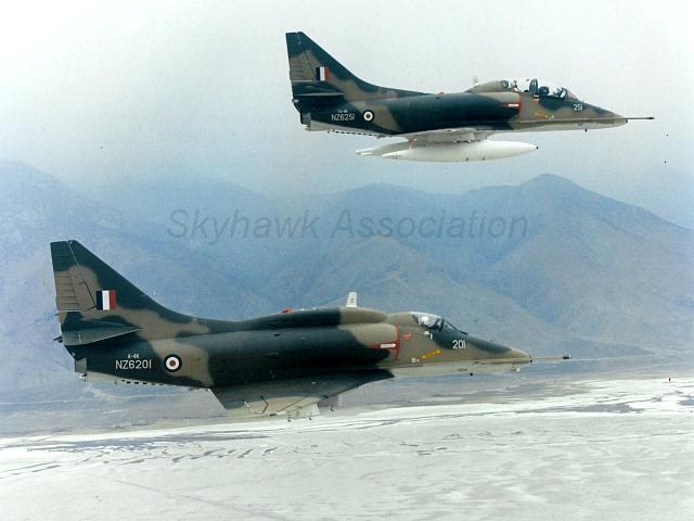 1970: Douglas photo of NZ6201 (157904) and NZ6251 (157914) in-flight over California. RNZAF 75 SQN is in the U.S.A. training and receiving their new A-4K Skyhawks. From Don Simms via Phil Thompson.