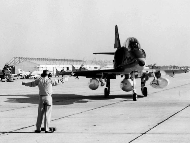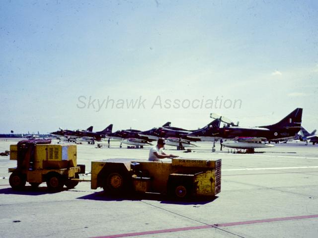 VA-44 flight line. L-r AD-406, A-4C BuNo 149594 (AD-426), TA-4F BuNo 152875 (AD-471) and A-4E BuNo 149651 (AD-452). RNZAF 75 SQN is in the U.S.A. training and receiving their new A-4K Skyhawks.