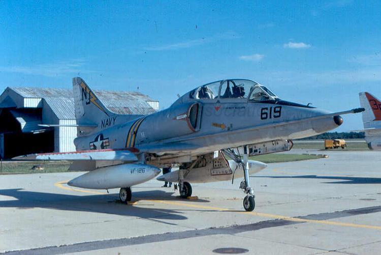 Unit Photos 196?: VA-126 GRUMMAN TF9J 1967: Photos from year book. Page1; .Page2; .Page3; .Page4; .Page5; .Page6; .Page7; .Page8; .Page9. Circa 1967: VF-126 TA-4F BuNo 153473, NJ-604, on the deck of USS Bennington (CVS-20) during carrier qualifications. Photo courtesy of Bob Lawson. 1968: BuNo 154335, NJ-608, on the ramp. Gary Verver Collection. 17 MAY 1969: Right view of VF-126 Bandits TA-4F Skyhawk BuNo 153492, NJ-644, on the ramp, Otis AFB, 17 May 1969. Copyright R.W. Harrison. Circa 1969: BuNo 154634, 02, parked on the line next to 01. Gary Verver Collection. September 1969: VF-126 Skyhawk BuNo 153468, NJ-600, assigned to CAPT Lou Page, Commander Readiness Attack Carrier Air Wing Twelve. Roy Lock. SEPT 1969: Right rear view of Commander Readiness Attack Carrier Air Wing Twelve TA-4F Skyhawk BuNo 153468, NJ-600, assigned to Capt Lou Page parked in a Miramar hangar. Photo from A. Hansen. 1969: BuNo 153470, NJ-601, parked on the ramp. Gary Verver Collection. OCT 1969: VF-126 Bandits TA-4F Skyhawk BuNo 153470, NJ-601, on the ramp at NAS Miramar. Name below the canopy rail is CDR Ken Wiley. The RF-8 Crusader at left is BuNo 146858. Photo by A. Hansen. Date unknown: Stevens "Woody" Woodburn at a open house with a VF-126 TA-4F. Photo provided by "Woody". 26 July 1972: VF-126 Skyhawk Diamond Four VF-126 TA-4Js in diamond formation over Avalon, Santa Catalina Island, California. Another shot. Picture from Harry S. Gann. August 3, 1972: VF-126 A-4E MONGOOSE SKYHAWKS Four VF-126 A-4Es in flying in right echelon and demonstrating their colorful paint jobs. Shortly after this picture was taken on August 3, 1972, Israel took delivery of most Navy A-4Es. Picture from Harry S. Gann. 1972: Bandits Skyhawk formation from l-r: NJ-613, NJ-617, NJ-618 and NJ-61. Douglas photo by Harry Gann. Circa 1973: BuNo 154289, NJ-613, parked on the ramp in the traditional grey over white scheme with a centerline tank. Name below the canopy rail is LCDR Chuck "Hellcat" Ringer. Gary Verver Collection. 1973: BuNo 152855, NJ-619, parked on the line. Gary Verver Collection. 1974: BuNo 154289, NJ-611, parked on the line. Gary Verver Collection. May 1974: VF-126 Ramp. NAS Miramar. Photo by Bill Curry from the Scott Van Aken collection. 05 June 1974: VF-126 NJ-619, BuNo 152855. LT Bill Mocock and Skyhawk designer Ed Heinemann in Bandits Skyhawk BuNo 152855, NJ-619, westbound over NALF San Clemente, San Clemente Island, CA. Navy photo. September 1974: Bandits Skyhawk BuNo 152861, NJ-614, parked on the line. Photo by Lorence R. Fizia. Date unknown: BuNo 152861, 14, parked on the ramp. Gary Verver Location. Date unknown: BuNo 152861, No. 00 parked on a wet tarmac. Gary Verver Location. September 1974: Bandits Skyhawk BuNo 153466, NJ-613, parked on the line. Photo by Lorence R. Fizia. September 1974: Bandits Skyhawk BuNo 153475, NJ-615, parked on the ramp. Photo by Lorence R. Fizia. 1974: BuNo 154289, VF-126 NJ-611, on the ramp. BuNo 155025, VF-126 NJ-626, on the ramp. BuNo 155064, VF-126 NJ-625, on the ramp. Date unknown: BuNo 155064, NJ-625, wheels down hook up. Photo from JD Stewart. Early 1990s: BuNo 155064, side no. 25, parked and tied down. Gary Verver Collection. 1975: VF-126 Skyhawk BuNo 153518, NJ-605, parked on the flightline. Unknown Photographer via W. Mutza. May 1975: Bandits Skyhawk BuNo 154617, NJ-600, assigned to RADM L.A. Snead II, attached to a tug and towbar. Assigned p/c is ADJAN Volheim. Unknown Photographer via W. Mutza. Artwork on BuNo 154617. Javier Ruberto. June 1975: Bandits Skyhawk BuNo 152858, NJ-620, parked on the flight line next to a USAF T-38 Talon. Gary Verver Collection. 1975: BuNo 154289, NJ-611, parked and roped off. Absent any intake covers, maintenance has covered the intake with paper, to prevent vistors from throwing their gum wrappers in it. Gary Verver Collection. June 1975: Bandits Skyhawk BuNo 152858, NJ-627, parked on the ramp adjacent to the hangar. Gary Verver Collection. 1975: VF-126 TA-4J BICENTENNIAL SKYHAWK. To celebrate America's Bicentennial the Skipper's TA-4J, 154290 NJ-601 was painted for America's birthday. Picture from Harry S. Gann. Circa 1975: Bandits Skyhawk BuNo 154290, NJ-601, as she comes in for a landing. R. Lawson. 11 NOV 1975: Left rear view of VF-126 Bandits TA-4J Skyhawk BuNo 154289, NJ-611, on the ramp, location unknown, 11 November 1975. Copyright R.W. Harrison. 1975: BuNo 154289, VF-126 NJ-611, on the ramp. VF-126 BuNo 159483 on the ramp. October 1975: Left side view of VF-126 Bandits TA-4J Skyhawk BuNo 154290, NJ-601, assigned to Hawk One, CDR Cole Black, parked on the ramp in the Bicentennial paint scheme. Photo from Fleet Audio Visual Center NAS Miramar, San Diego, CA. Gary Verver Collection. 30 November 1975: VF-126 TA-4J BuNo 154289, NJ-611. Photo by C. Gerdes, G. Verver collection. December 1975: Bandits Skyhawk BuNo 154290, NJ-601, assigned to Hawk One, CDR Russel, parked on the ramp. Unknown Photographer via W. Mutza. 1975-76: Bandits' Skyhawk BuNo 154632, NJ-614, painted in a blue/grey camouflage scheme. J.D. Stewart. 1976: BuNo 154290, VF-126 NJ-601, in Bi-centennial colors. VF-126 TA-4J BuNo 152861, NJ-600, on the ramp. VF-126 TA-4J BuNo 152861, NJ-600, on the ramp. VF-126 A-4E, BuNo 151059, on the ramp. Another shot of 32. April 1976: VF-126 BuNo.153669 at Hill AFB. Photo copyright by Joe Cupido and used with his permisson. Provided by Gary Verver. 1976: BuNo 154200, NJ-601, parked on the line. Gary Verver Collection. 1976: BuNo 154314, TA-4J, NJ-632, parked on the ramp. Gary Verver Collection. 10 May 1976: Bandits Skyhawk BuNo 154290, NJ-601, assigned to CDR Russell, HAWK One, parked on the ramp in its Bicentennial paint scheme. Photo by T.R. Waddington, Gary Verver Collection. Circa 1976: 24 September 1977 - BuNo 153518, NJ-605, parked on the ramp in a white and blue paint scheme. Photo by G.B. Rhodes, G. Verver collection. 1977: VF-126 TA-4J SKYHAWKS; Bandits' Skyhawk BuNo 154288, NJ-622, and NJ-606/608 fly low over San Diego, California. Lin