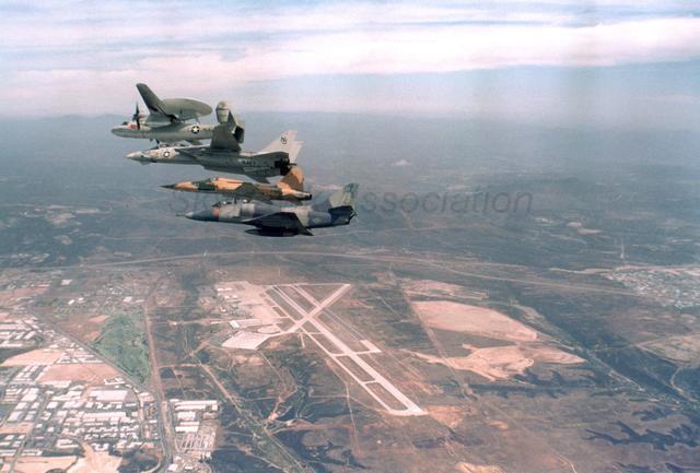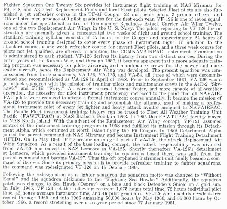 Events March 1956: VA-126 assigned with thirteen Chance-Vought F7U-3M, Cutlass was based at Naval Air Station Miramar after returning from a WESTPAC cruise on United States Ship Hancock. The Squadron was located in the old "nose dock" hangers (now gone) at Miramar. The big concrete hangars had not yet been built. Sharing the area was sister squadron, VA-116, also flying the F7U-3M. April 6, 1956: Present squadron established from VA-126, VA-125 and VA-54. All three were de-commssioned and recommissioned as VA-126. Squadron mission was to provide instrument training in jets. 1958: Air Pac Champs 15 OCT 1963: Re-designated VF-126. OCT 1964: VA-126 began providing adversary missions. During the Vietnam War they used the TF-9J, TA-4F and the A-4E for adversary training. MAR 1965: I transferred into the squadron as an AEAN in March 1965. I was stationed at NAS Coronado, VP-31, and was training as an air-crewman on the P5Ms (a.k.a. pig-boats) when they were decommissioned. The P5Ms and P2Vs were being phased out by the P3 Orions stationed at NAS Moffet Field, Detachment Alfa. I checked into VF-126 under the command of Cdr. R. A. Braid and served under Cdrs. Verne Hubka, R. E. "Fishhook" Mcjunkin, Jr., and W. J. Hickman. When I checked into the squadron, they were flying TF9J Cougars and performed maintenance in nose docks. Our squadron spaces were wooden buildings and the area in which they were located was called "Splinterville." Our next door neighbor was squadron VU7 (a.k.a. Vacation Unit 7), The squadron was training pilots in advanced instrument flying called "flying under the hood" because a curtain kept the pilots from looking out when flying instruments. While at VF126 I obtained an OMIS card so I could fly back-seat in the TF9J. In 1965, NAS Miramar had a "pick rocks beer bust" to clear the space for its new golf course. There was free beer for the men that toiled for that purpose. The designation VF126 replaced the VA126 in a small ceremony. A metalsmith whom we called, "Far East Foster," was photographed "painting" the new designation on a TF9J. The Nulli Secundus (Second to None) squadron patch was replaced by the diving eagle with a background shield divided in half, the yellow depicting day, and the dark with stars depicting night. Otherwise, VF126's training for day/night flying capability. In 1967, we had a ceremony to "push off" the last TF9J. Men were photographed pushing the last TF9J off, otherwise replacing them with the TA4J which we recently received. Ironically, the last TF9J did not start for the ferry pilot. However, when I was assigned to check out the aircraft, it started immediately. The next day the last TF9J was gone, being fully replaced by the TA4Js. I was not fully checked out on the TA4J because I was being discharged. In 1973, I was assigned to VT24 in NAS Beeville, Texas where they flew the TA4Js. The TA-4J was a nice flying aircraft. I flew back-seat numerous times. Wallace Begay, USN Retired. Historian, U. S. West, University of New Mexico APR 1967: VF-126 started providing the adversary mission from NAS Miramar in April 1967. They also had several other missions, Pacific Fleet Out-Of-Control flight training and instrument training. November 9, 1967: Lt. John M. Nash ejected safely from his A-4 Skyhawk (BuNo 153520) after a mid-air collision with VF-121 F-4B Phantom BuNo 153033, NJ-115, about 40 miles offshore from San Diego Thursday. Phantom RIO Lt. Nicholas J. Preis, 27, and the unnamed pilot are both missing. Long Beach Independent, Friday, November 10, 1967. The Navy Friday terminated the search for two fliers lost in the collision of two jets Thursday. Presumed dead are Ens. Robert A. Arsenult, 21, and Lt. Nicholas J. Preis, 27. A4 Skyhawk pilot Lt. John M. Nash was rescued by a helicopter shortly after the collision. Pacific Stars and Stripes, Monday, 13 November 1967. Lt. John M. Nash, survivor of a two-plane collision last Thursday has returned to duty at NAS Miramar. The pilot and flight officer of the F4B Phantom were declared lost at sea. Laurel Leader Call, Thursday, 16 November 1967. April 23, 1968: LCdr. Richard "Dick" Lord (Royal Navy Air Warfare Instructor) ejected from TA-4F BuNo 153472 near NAS Miramar. March 3, 1969: NWFS is established as a school within VF-121 utilizing VF-126 A-4 a/c and maintenance assets. VF-126 Bandits handled the day-to-day aggressor role while the TOP GUN Instructors flew graduate level missions against their students. VF-126 continued the "Bandit" mission October 7, 1971: Lt. Gary Meador, 26, ejected safely and Cdr. Edward Stanley Hosepia, 38, was killed when their Skyhawk (BuNo 152859) began losing altitude and crashed Wednesday after take-off from NAS Miramar while on an instrument training flight. Press-Telegram, Long Beach, CA. Thur., Oct. 7, 1971.