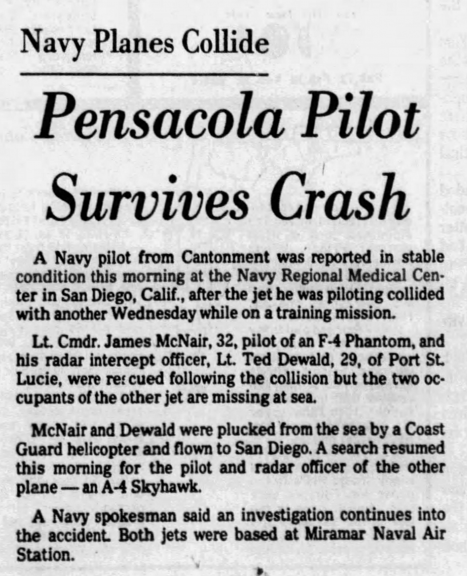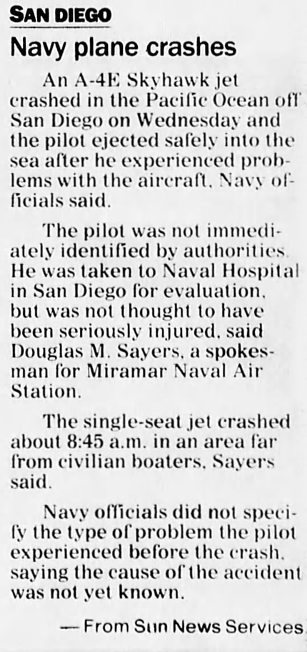 October 25, 1974: Lt. Eric Johnson, 25, and Lt. Paul Edward Kane, 26, both from NAS Miramar, were missing Friday after their TA-4 (BuNo 153468) plunged into the ocean and apparently sank 60 miles west of San Diego, CA. The Des Moines Register, Saturday, October 26, 1974. Lt. Eric Johnson, 25, and Lt. Paul Edward Kane, 26, whose jet training plane crashed 60 miles at sea were presumed dead Friday and a search was abandoned. A NAS Miramar spokesman said an empty life raft and debris were found. Manchester Journal Inquirer, Saturday, 26 October 1974. February 28, 1975: Two unknown pilots were picked up by the MCAS Search and Rescue helicopter after their TA-4 jet trainer (BuNo 154329) from NAS Miramar, CA, crashed in the Chocolate Mountain training area 34 miles NW of Yuma at approximately 1:40 p.m. Friday. One man had a broken left arm and the other a laceration on the face. Yuma Daily Sun, Sunday, 02 March 1975. March 27, 1975: Lt. Jeffrey Woodfield and LCdr. Ralph Gaither ejected safely when their Skyhawk trainer (BuNo 158132) crashed near the Salton Sea while on a routine training flight from NAS Miramar. The Yuma Daily Sun, Fri., Mar. 28, 1975. January 14, 1976: unknown crew ejected safely when their TA-4 Skyhawk (BuNo 154617) crashed off the Southern California coast Thursday shortly after take-off from NAS Miramar. Independent Press Telegram, Long Beach, CA, Friday, January 16, 1976. January 6, 1977: Lt. Wayne R. Olson, 35, and Lt. Eugene M. DerManuel ejected safely when their A-4 Skyhawk (BuNo 153475) went into a 400 foot skid and burst into flames on take-off in the rain Thursday. The Press Courier, Friday, January 7, 1977. January 26, 1977: Unknown pilots ejected safely when their TA-4 ( BuNo 153664) departed controlled flight. During an advanced tactics support mission with two F-14's the TA-4 passed close aboard one of the F-14's commencing the final engagement and started a level starboard turn at 375 knots and 22,000 feet. After about 180 degrees of turn the TA-4 pilot visually acquired the second F-14 at his 4-5 o'clock position. The TA-4 continued the Starboard turn into the 2nd F-14 and increased the G loading to 3-4 G's. The TA-4's airspeed dropped off to 325 knots at 21,000 feet in a 90-degree angle of bank, nose slightly low. The TA-4 almost immediately departed controlled flight with a violent right roll and negative G loading. It then commenced a high yaw rate with continued negative G loading. The pilot was forced up and forward against the glare shield while the rear seat copilot was forced up into the canopy. Perceiving that the TA-4 was in an inverted spin the pilot initiated anti-spin controls at about 17,000 feet with no apparent effect. Passing through 12,000 feet the co-pilot ejected taking the pilot with him as command ejection was inadvertently set to the back seat. NAN, Grampa Pettibone, September 1977. June 2, 1977: LCdr. John W. Snyder Jr., 33, and Lt. Richard A. Smith, 30, both ejected safely during takeoff Thursday when their TA-4 Skyhawk BuNo 152864 burned after slamming into a NAS Miramar runway on take-off. The Press Courier, Friday, June 3, 1977. August 2, 1978: Lt. George R. Sidorakis, 30, ejected safely after his A-4 Skyhawk (BuNo 154314) collided with an F-14 Tomcat while on a routine training mission 80 miles southwest of San Diego. The F-14 (F-14A 160652) landed safely at NAS North Island with a damaged right wing and Sidorakis was rescued by helicopter. The News Journal, Thursday, 03 August 1978. January 31, 1979: Lt. Bob Hughes and his back seater (VF-121 RIO) Tom Rippinger were killed in a mid-air collision between VF-126 TA-4J (BuNo 154288) and VF-121 F-4J (BuNo 153878, NJ-143.) Serving as an adversary pilot of VF-126, Hughes was leading two Skyhawks in a two-v-two free-flight maneuvering evolution at 25,000 feet off the California coast, near San Diego. The lead Phantom II was being chased in a turn by Hughes in his TA-4J at 25,000 feet when the pilot of VF-121 F-4J BuNo 153858 tried to come to the aid of his leader by allegedly performing an out-of-order "blind lead turn" into his adversary - a maneuver that was strictly prohibited during ACM training. The end result of this turn was that the VF-121 jet collided with the pursuing Skyhawk, rendering the F-4J uncontrollable and forcing the crew to eject. Both men were quickly recovered with minor injuries. Neither the TA-4J or its two crewmen (Hughes and back seater VF-121 RIO Tom Rippinger, who was catching a bonus hop) were found despite a detailed search of the surrounding waters. (via Peter Mersky.) LCdr. James McNair, 32, pilot of an F-4 Phantom, and his RIO, Lt. Ted Dewald, 29, were rescued by a Coast Guard helicopter following a collision with an A-4 Skyhawk Wednesday. The two occupants of the Skyhawk are missing at sea and the search resumed this morning. The Pensacola News, Thursday, February 1, 1979. The Arizona Republic, February 1, 1979. October 31, 1980: unknown pilot was killed … VF-126 TA-4J BuNo 154290 was destroyed at Salt Lake City after aircraft crashed into desert following simulated missile shot, 31 October 1980. Pilot fatal. Naval Safety Center via Jim Winchester. October 5, 1989: Lt. Ken Wesselman and Lt. Tom Twomey ejected safely and were rescued by a Navy helicopter when their Miramar based adversary squadron TA-4 Skyhawk (BuNo 154339) crashed 70 miles SW of San Diego on Thursday while on a routine training mission. The Los Angeles Times, Saturday, 07 October 1989. Lost control in a dive, crashed into the Pacific off the coast of CA. VF-126 TA-4F BuNo 154339 was destroyed at North Pacific Ocean (above Lat. 45 Deg. N) when aircraft was lost at sea during ACM sortie. 05 October 1989. 0 fatalities. Naval Safety Center via Jim Winchester. October 3, 1991: Cdr. John Roach (VF-126 based at Miramar) ejected and was killed Wednesday when his A-4 Skyhawk (BuNo 150073) crashed into the Pacific about 60 miles off San Diego, CA. Pacific Stars and Stripes, Saturday, October 5, 