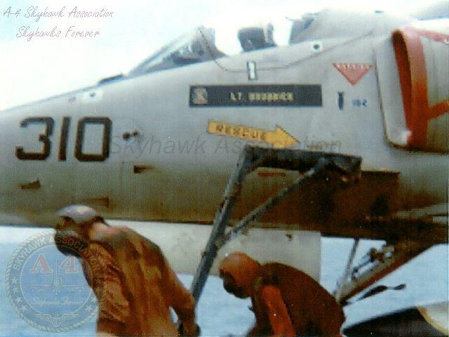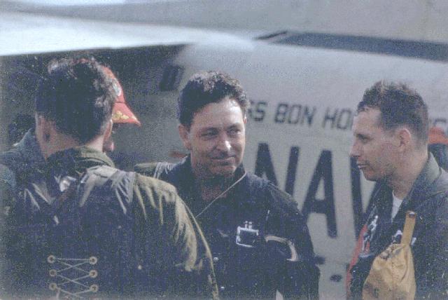 March through May 1965: The Rampant Raider Skyhawks participated in special operations in Southeast Asia, including the Rolling Thunder campaign, strikes against designated military targets in North Vietnam. March 26, 1965: Cdr. K.L. Shugart ejected (BuNo. 150130) after his aircraft was hit on his 2nd run dropping SNAKEYE bombs on the Vinh Son radar site. The aircraft caught fire and suffered an electrical failure and he ejected about 10 miles offshore and was rescued by a USAF helicopter. April 19, 1965: Lt(jg). Grade James Paul Shea of VA-215 flying a Douglas A-1H Skyraider BuNo. 139818, was shot down by North Vietnamese anti-aircraft fire. Lieutenant Junior Grade Shea was Killed in Action. November 10, 1965 to August 1, 1966: VA-212 Rampant Raiders with CVW-21 deployed in USS Hancock CVA 19 to WestPac/Vietnam flying the A-4E Skyhawk. The VA-212 assigned side number was NP 2xx during this cruise. This was VA-212's second of eight Vietnam combat cruises. March 1966: Rampant Raider aircraft participated in Operation Jackstay, providing combat air support for amphibious operations that cleared the Rung Sat zone southeast of Saigon. March 27, 1966: LCdr. V.G. Donnelly ejected and was rescued, lost to flame-out. 1704 A4 Bureau No. 150128 of VA-212, Pilot LCdr. Donnelly, crashed into the sea bearing 280 deg. T 11 miles latitude 8-29.5N longitude 107-06.0E and sank in 21 fathoms of water. Pilot recovered by helicopter. 1713 Recovery complete. 2116 received injury report at 1700 this date while ejecting from his aircraft LCdr. V.G. Donnelly, 545128 received contusions of upper 2nd anterior portion of left shoulder. Treatment administered by medical officer. Disposition: Duty. USS Hancock deck log, Sunday, 27 March 1966. April 6, 1966:Lt. Dennis Philip Cook killed, cat malfunction. 0534 A4E Bureau No. 152052, VA-212, Pilot Lt. Dennis Phillip Cook, crashed into the sea off the ships bow at latitude 17-56.0N, longitude 108-11.0E and sank in 50 fathoms of water. 0534 maneuvered to avoid aircraft. All engines stopped. 0539 c/s to 19 knots. USS Hancock deck log, Wednesday, 06 April 1966. May 1, 1966: Lt. R.H. Mansfield ejected (BuNo. 151179) and was rescued by a Navy helicopter after firing a rocket from a LAU-3 which either hit his Skyhawk or fodded the engine while attacking a truck convoy 10 mile S of Vinh. June 27, 1966: Lt. Gary Thiele ejected safely when his Skyhawk (BuNo 150000) caught fire on his way to a target in South Vietnam. 1109 received report of downed pilot position 11-00.0N, 108-34.0E, ships helo detached to proceed to area of downed pilot. 1205 A4E pilot Lt. Gary Thiele was recovered from the water and returned to Than Rang Air Field. USS Hancock deck log, Monday, 27 June 1966. June 30, 1966: Cdr. Homer L. Smith, the squadron's Commanding Officer, was awarded the Silver Star for leading an air strike against the Bac Giang, North Vietnam POL facility. October and November 1966: During the training cycle, VA-212 aircraft were modified to incorporate the Walleye weapons system thus becoming the first fleet unit equipped with the Walleye. January 26, 1967 to August 25, 1967: VA-212 Rampant Raiders with CVW-21 deployed in USS Bon Homme Richard CVA 31 to WestPac/Vietnam flying the A-4E Skyhawk. The VA-212 assigned side number was NP 2xx during this cruise. This was VA-212's third of eight Vietnam combat cruises. March 11, 1967: The Rampant Raider's commanding officer, Cdr. Homer L. Smith, conducted the first Walleye combat attack, striking the Sam Son Army Barracks. Commander Homer Smith (center) in a post flight Bon Homme Richard Flight Deck Debrief --- Left to right: Back to camera, F-8 Crusader pilot; Red ball cap - Paul Spear; VA-212 commanding officer Homer Smith; Guy to right - unknown. April 25, 1967: Lt(jg). Al R. Crebo ejected and was rescued after an SA-2 missile exploded close to his A-4E Skyhawk BuNo 151102 , NP 225 during an attack on an ammo depot on the outskirts of Haiphong. After flying out to sea on manual control he ejected near a Bon Homme Richard escort destroyer when the engine flamed out. LTJG A. R. Crebo in Rampant Raider A-4E Skyhawk BuNo. 151102, side number NP 225 was shot down by a North Vietnamese surface to air missile. May 1, 1967: Lcdr Ted R. Swartz of the VA-76 Spirits flying A-4C Skyhawk BuNo. 148609, side number NP 685 shot down a MiG-17. May 20, 1967: Cdr. Homer Leroy Smith (CO) ejected and was captured when his Skyhawk (BuNo 149652, NP 233) was hit by AAA and caught fire during a strike on the Bac Giang thermal power plant. Cdr. Smith died after a few days in captivity. Commander Homer L. Smith was awarded the Navy Cross for his action during strikes on the Bac Giang Thermal Power Plant on 19 and 20 May. May 31, 1967: LCdr. Arvin Roy Chauncey ejected and was captured when his Skyhawk (BuNo 151113, NP 223) was hit by intense AAA about 20 mile NE of Kep. His aircraft was hit in the engine, caught fire and lost power. May 31, 1967: Lt(jg). M.T. Daniels ejected and was rescued by the SAR Destroyer's Seasprite helicopter after his Skyhawk (BuNo 151183, NP 229) was hit by AAA about eight miles NE of Kep. He headed out to sea in search of a tanker but couldn't rendezvous as his radio was inop. Unable to refuel he found a SAR destroyer and ejected when the engine flamed out. July 12, 1967: LCdr. J.H. Kirkpatrick ejected and was rescued by a Navy SAR helicopter after his Skyhawk (BuNo 151181, NP 228) was hit in the port wing and fuselage by ground fire on his way to a strike on the railway at Mai Truong. July 20, 1967: Cdr. Fredrick H. Whittmore (XO) ejected over the sea 60 miles east of Hon Gay and was rescued after his Skyhawk (BuNo 151119, NP 222) was hit by AAA during a strike on the My Xa POL storage site. October 1967: The VA-212 Rampant Raiders were assigned the Douglas A-4F Skyhawk. January 27, 1968 to October 10, 1968: VA-212 Rampant Raiders with CVW-5 deployed in USS Bon Homme Richard CVA 31 to WestPac/Vietnam flying the A-4F Skyhawk. VA-212 was ass