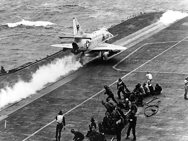 October 29, 1960 to June 6, 1961: VA-212 Rampant Raiders with CVG-21 deployed on USS Lexington CVA 16 to WestPac flying the FJ-4B Fury. March 1961: USS Lexington CVA 16, with VA-212 Rampant Raiders embarked, was ordered to operate off the coast of Thailand as a result of the deteriorating position of Laotian government forces against the Communists. Units of Lexington's air group flew reconnaissance missions over Laos while on station. June 20, 1961: The VA-212 Rampant Raiders were assigned the Douglas A4D-2 (A-4B) Skyhawk. September 15, 1961: VA-212 Rampant Raiders moved to Naval Air Station Lemoore, California. February 2, 1962 to August 24, 1962: The Rampant Raiders with CVG-21 deployed on USS Hancock CVA 19 to WestPac with the A4D-2 Skyhawk. April 15, 1962: VA-212, embarked in USS Hancock CVA 19, operated off the coast of South Vietnam during the arrival of the first USMC advisory unit in the Republic of Vietnam. May 16 through 20, 1962: Following the continued successes of the Pathet Lao forces against Laotian government forces, particularly along the border with Thailand, the Thai government requested United States support. A unit of the United States Marines landed in Bangkok and moved by air to Udorn. VA-212, along with other units of CVG-21, embarked in Hancock, operated in the area and were available to provide air support for the Marines if required. June 7, 1963 to December 16, 1963: VA-212 with CVG-21 deployed in USS Hancock CVA 19 to WestPac flying the A-4B Skyhawk. September 1963: VA-212, embarked in USS Hancock CVA 19, operated off the coast of Taiwan due to increased tensions between the People's Republic of China and the Republic of China. November 1963: USS Hancock, with VA-212 embarked, operated off the coast of South Vietnam following the coup that overthrew President Diem. January 2, 1964: The VA-212 Rampant Raiders were assigned the Douglas A-4E Skyhawk. June 24, 1964:Lt(jg). Barry Gastrock, 27, ejected safely from his VA-212 A-4E Skyhawk (BuNo 150133) when it crashed and burned about 5 miles NW of the NAS Lemoore runway starting a fire that burned two to three acres of stubble before being brought under control. The Fresno Bee, Thursday, 25 June 1964. October 21, 1964 to May 29, 1965: The Rampant Raiders with CVW-21 deployed in USS Hancock CVA 19 to WestPac/Vietnam flying the A-4E Skyhawk. The VA-212 assigned side number was NP 2xx during this cruise. This was VA-212's first of eight Vietnam combat cruises. February 7, 1965: Following the shelling of an American advisors' compound at Pleiku by the Viet Cong, VA-212 participated in reprisal attacks against targets in North Vietnam. During the strikes, named Flaming Dart I, VA-212's Skyhawks struck the Dong Hoi Barracks. February 11, 1965: VA-212's Skyhawks participated in Flaming Dart II operations, reprisal attacks against the barracks at Chanh Hoa.
