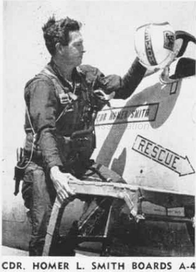 Cdr. Smith began flying combat missions in Southeast Asia off the aircraft carrier USS Hancock (CVA-19) in December 1965, took command of VA-212 in June 1966 and finished his first tour in July 1966. He returned for his second tour in February 1967 aboard the aircraft carrier USS Bon Homme Richard (CVA-31.) Cdr. Smith was forced to eject over North Vietnam on May 20, 1967 (his 200th combat mission) while leading an Alpha strike on the Bac Giang thermal power plant near Phu Lang Thuong, about 25 miles NE of Hanoi. Cdr. Smith was captured and was tortured to death by his North Vietnamese captors on May 21, 1967, and his remains were returned to the United States on March 13, 1974. He was buried at the U.S. Naval Academy Cemetery in Annapolis, MD. Cdr. Smith was posthumously promoted to the rank of Captain and awarded the Navy Cross, the Navy's highest combat award, for extraordinary heroism. By his inspiring and courageous devotion to duty, Captain Smith upheld the finest traditions of the United States Naval Service. Capt. Smith is remembered on "The Wall," Panel 20E, Line 68.