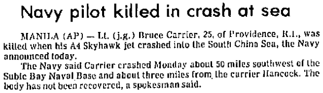 August 2, 1969 to April 15, 1970: The Rampant Raiders with CVW-21 deployed in USS Hancock CVA 19 to WestPac/Vietnam flying the A-4F Skyhawk. VA-212 was assigned side number NP 3xx during this cruise. This was VA-212's fifth of eight Vietnam combat cruises. February 9, 1970: Lt. John Arthur Griner was killed when he ejected as his Skyhawk (BuNo 155005, NP 307)) veered off the runway when he diverted to Da Nang with hung ordnance after a strike mission, 09 February 1970. 1700 Held Memorial Service for Lt. John A. Griner, VA-212. USS Hancock deck log, 12 February 1970. I recall that CAG mandated we divert to Da Nang if we had hung bombs rather than jettisoning the TER. Westpac had a shortage of the triple ejector racks. John complied. At touchdown the aircraft started to leave the runway and John ejected into an arresting gear stanchion as the aircraft rolled. From Kip Burton, 27 February 2016. It was his second hop of the day. He blew a main tire on the cat stroke. He had a hung bomb and diverted to Da Nang, but didn’t execute a field arrestment with the blown tire and on touchdown the aircraft left the runway and headed for the arresting gear unit. It appears that he did not initiate ejection until he hit the arresting gear installation because the airplane was inverted and the seat took him into the ground or into the arresting gear unit itself. From Roger Shinkle, 28 February 2016. The Skyhawk was repaired at Atsugi and sent to VA-127 on 24 Nov. 1971 almost two years after the accident. March 8, 1970: Lt. Gary B. Smith ejected safely when A-4F BuNo 154994 exploded and crashed into the sea off the starboard bow at latitude 18-08.0N and longitude 107-48.9E and sank into the sea in 44 fathoms of water at 0835. Pilot recovered by helo 005 with no apparent injuries at 0907. USS Hancock deck log - 8 March 1970. March 15, 1970: LCdr. R.W. Hunter ejected (BuNo 155044, NP 307) and was rescued by Hancock's helicopter about 90 miles NE of Dong Hoi after his Skyhawk was hit by 37mm AAA on a daylight Steel Tiger strike on a section of road near Ban Topen. 1435 A-4 in the water off the starboard beam at (130 deg.) at five (5) miles. Ships position 17-51.9W 107-50.9E. Water depth 43 fathoms. 1441 Pilot out of water. 1503 Received information on Pilot Name: LCdr Hunter. Plane side number 307. Plane BuNo 505044 (sic). Squadron VA-212. Medical report Pilot alright scratched knee taking X Rays. Weather condition clear sky with visibility of five (5) miles Sea temp 75 Air temp 77 with three foot seas aircraft downed by enemy fire and could not be controlled. USS Hancock deck log, Sunday, 15 March 1970. October 22, 1970 to June 3, 1971: VA-212 with CVW-21 in USS Hancock CVA 19 deployed to WestPac/Vietnam flying the A-4F Skyhawk. VA-212 was assigned side number NP 3xx during this cruise. This was VA-212's sixth of eight Vietnam combat cruises. January 7, 1972 to October 3, 1972: VA-212 with CVW-21 in USS Hancock CVA 19 deployed to WestPac/Vietnam flying the A-4F Skyhawk. VA-212 was assigned side number NP 3xx during this cruise. This was VA-212's seventh of eight Vietnam combat cruises. April 1972: With the North Vietnamese invasion of South Vietnam, the Easter Offensive, the squadron concentrated its strikes in the area of An Loc, South Vietnam. It provided combat air support for United States and South Vietnamese ground forces defending the city. May 1972: VA-212 participated in Operation Linebacker I, heavy air strikes against targets in North Vietnam. May 25, 1972: Cdr. Henry Hooker Strong (VA-212 CO) was killed during a strike on the Ben Thuy road bridge three miles S of Vinh. His aircraft (BuNo 155045, NP 301) was last seen by his wingman as he rolled in on the target. There wasn't any sign of wreckage or an ejection and was most likely lost to AAA. July 9, 1972: Cdr. Frank Gifford Green (BuNo 154972, NP 312) was killed when he flew into the ground while attacking a truck on a road near Dam Khanh, 50 miles S of Hanoi in a light haze at night. September 6, 1972: Lt. W. F. Pear in Rampant Raider A-4F Skyhawk BuNo 155021, NP 304 was shot down by North Vietnamese anti-aircraft fire. Lt. W.F. Pear rescued by USS Gridley (DLG-21/CG-21) HC-7 Sea Devils Det. 110 HH-3A Sea King 15 miles, 154⁰ from Thanh Hoa, five miles off shore, Hwy 1A. March 12, 1973: Lt. Frank Schwab, 27, ejected safely when his NAS Lemoore based A4 Skyhawk (BuNo 155020) developed engine trouble while on a routine post maintenance check flight Monday. The plane crashed into a farmer's field 5 miles NE of Hanford and Schwab, attached to VA-212 at Lemoore, walked to a house and phoned the base to report the crash. He was picked up by a helicopter and returned to Lemoore. Bakersfield Californian, Wednesday, 14 March 1973. "The aircraft was going to be transferred to the Marines, so I was doing a maintenance test flight after heavy maintenance. I was headed to NAS Fallon at 18,000 feet and cleared to Fl230. I pushed the power up and heard a loud bang followed by the oil pressure dropping to zero, I declared an emergency and left the power back. The bearings ultimately froze the engine and I descended to about 8,000 feet, slowing to 150 knots and ejected. I later found the guy that packed my chute and bought him a bottle of Whiskey." Frank P. "Phil" Schwab. May 8, 1973 to January 8, 1974: VA-212 with CVW-21 in USS Hancock CVA 19 deployed to WestPac/Vietnam flying the A-4F Skyhawk. VA-212 was assigned side number NP 3xx during this cruise. This was VA-212's eighth and last Vietnam combat cruise. October and December 1973: With the outbreak of war in the Middle East between Israel, Syria and Egypt and the initiation of the Arab oil embargo, USS Hancock, with VA-212 embarked, was ordered to enter the Indian Ocean and operate in the Arabian Sea. July 12, 1974: Capt. John Pryor Emmett Jr., was killed when his A-4F Skyraider (sic) (BuNo 155032 ) crashed in a big ball of flame 12 miles east of Hawthorne, NV Friday. The A-4F based at NAS Lemoore was 