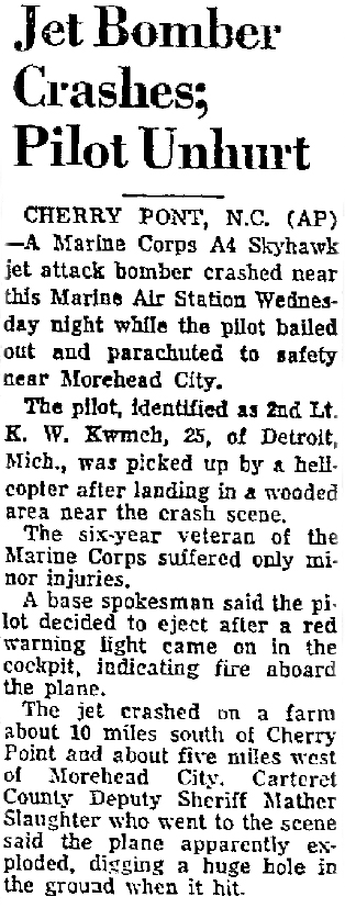 February 8, 1967: 2nd Lt. K.W. Kwmch, 25, ejected safely when his MCAS Cherry Point A-4 Skyhawk (BuNo 149582) crashed on a farm about 10 mile south of Cherry Point and 5 miles west of Morehead Wednesday night after the fire warning light came on. The Danville Register, Danville, VA, Thursday, February 9, 1967.