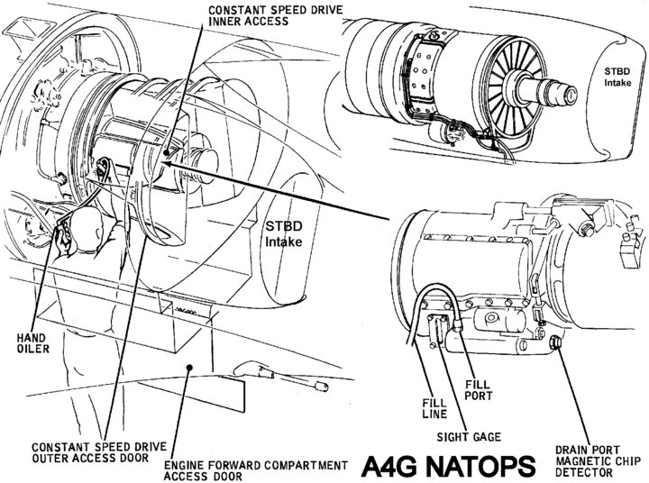 Skyhawks utilized a constant speed generator mounted to the front of the engine. The electrical system requirements were three phase 400 Hertz 115/200VAC, and 28VDC.